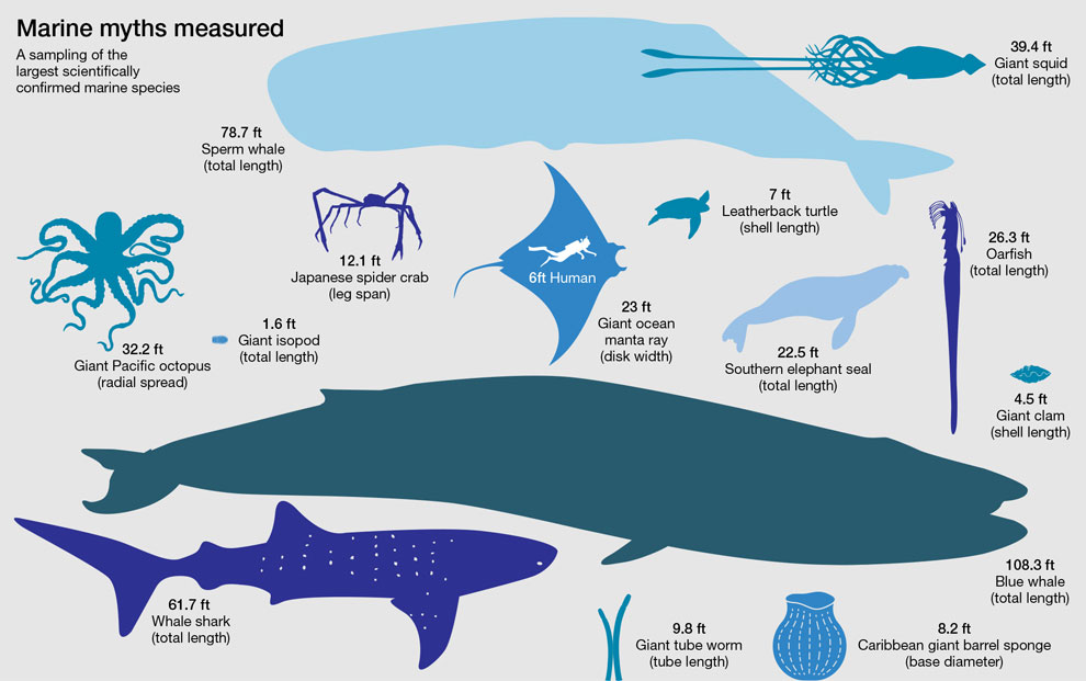 Answering important questions: just how big are the biggest animals in the ocean? Great chart; please click to enbiggen! What strikes me is that mammals are the largest animals in the sea, as they are on land. Clearly a successful strategy for preserving entropy! |